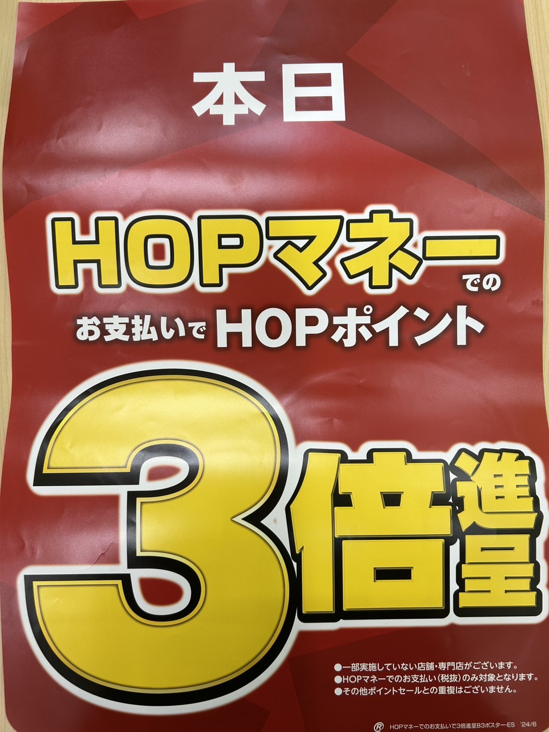 本日と明日の25日・26日はHOPマネーのお支払いでHOPポイント3倍進呈の日です!