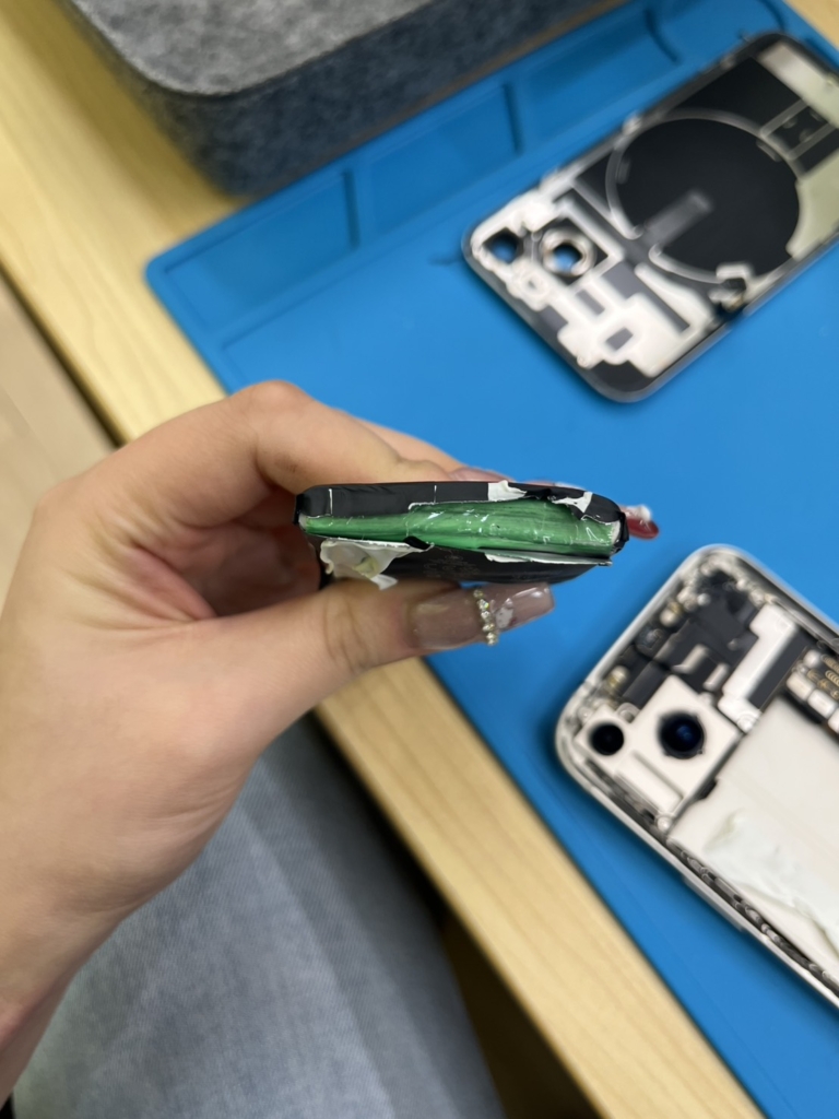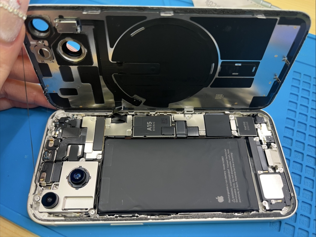 iPhone14からバッテリー交換は背面を開ける仕様となったので背面を開けていくとツンッと異臭が。