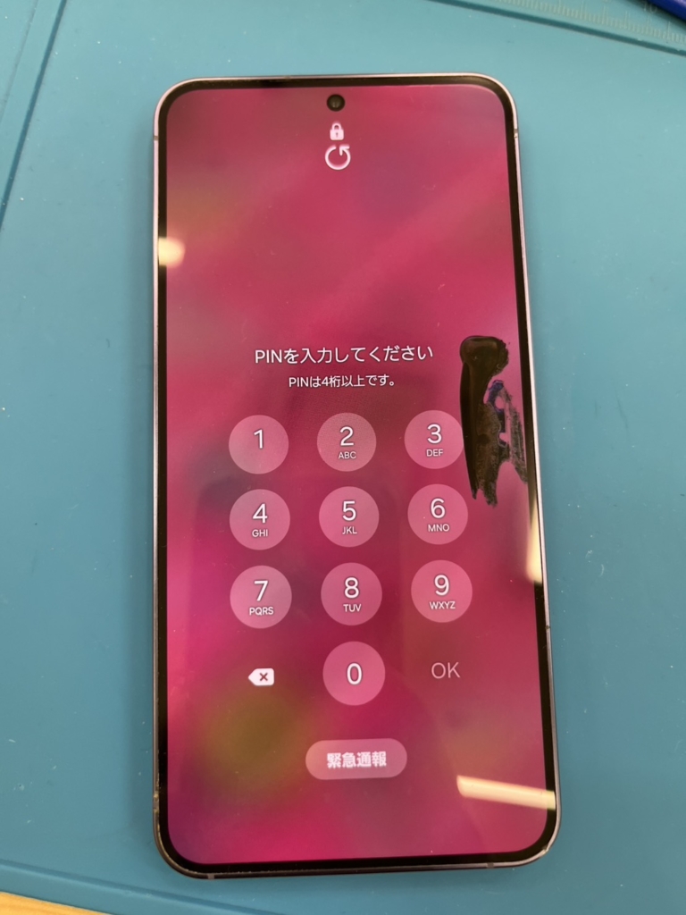 非常にベゼル幅(ディスプレイの黒枠)が狭い端末なので外れないように頑丈に固定し作業は完了。